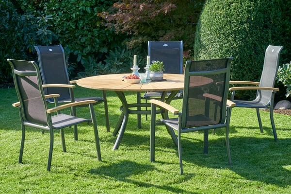 Der Tisch ist gefertigt aus pulverbeschichtetem Aluminium in der Farbe Xerix (Anthrazit) und wird optisch perfekt durch die runde Tischplatte aus SVLK-zertifiziertem Teakholz ergänzt. Die Maße von ca. Ø 150 x 74 cm sorgen dafür, dass stets ausreichend Ablagefläche zur Verfügung steht und Ihre Gäste bequem genügend Platz finden. Das Highlight dieses Tisches ist das Granitinlay, das bei Bedarf problemlos herausgenommen und durch den im Lieferumfang enthaltenen Eiskühler ausgetauscht werden kann. So haben Sie auch bei sommerlichen Temperaturen stets gekühlte Getränke direkt zur Hand. Mit den Stapelsesseln aus der Alice Serie kommt die perfekte Kombination aus Stil und Komfort in den heimischen Garten – denn das Modell besticht nicht nur durch den robusten Aluminiumrahmen und die hochwertigen Armlehnen aus FSC®-Teakholz, sondern auch durch die leicht geschwungene Rückenlehne, die herausragenden Komfort bietet. Mit Maßen von ca. 71 x 63,5 x 107 cm, einer Sitzhöhe von ca. 44 cm und einer Sitzfläche von ca. 46 x 46 cm passt er perfekt zum Tisch. Die Sessel sind in einem edlen xerix / schwarz gehalten, lediglich die Armlehnen aus FSC®-zertifiziertem Teak sind farblich hervorgehoben. Die verwendeten Materialien sind extrem witterungsbeständig und pflegeleicht, daher können die Möbel auch bei schlechtem Wetter ohne Probleme auf Ihrer Terrasse stehen bleiben. Teakholz hat aufgrund des hohen Anteils an holzeigenen Ölen einen natürlichen Schutz gegen Pilze und Schädlinge. So beschränkt sich die Pflege Ihrer neuen Möbel auf ein Minimum und Sie können Ihre Zeit im Garten mit angenehmen Tätigkeiten verbringen. Die 4×4 Textilenbespannung (70% Polyvinylchlorid, 30% Polyester) der Sessel ist beständig gegen UV-Strahlung, sodass die Farben lange frisch aussehen. Außerdem trocknet sie nach einem kurzen Schauer sehr schnell. Falls die Sessel aber doch mal weggeräumt werden sollen, können sie schnell und einfach gestapelt und platzsparend verstaut werden. Zum Schutz Ihrer Terrasse sind die Sessel und der Tisch mit Fußkappen ausgestattet, welche unschöne Kratzer auf dem Boden vermeiden. Die FSC® bzw. SVLK-Zertifizierung der Möbel garantiert Ihnen, dass das Holz aus verantwortungsvollen Quellen stammt, sodass Sie sich entspannt zurücklehnen und Ihren neuen Gartenstuhl so richtig genießen können.