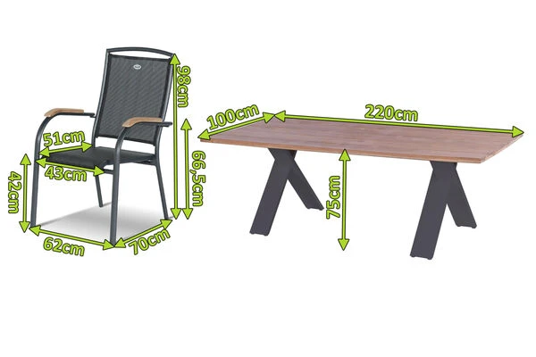 Der Tisch mit dem gekreuzten Gestell ist gefertigt aus pulverbeschichtetem Aluminium in der Farbe Xerix (Anthrazit) und wird optisch perfekt durch die Tischplatte aus SVLK-zertifiziertem Teakholz ergänzt. Die Maße von ca. 220 x 100 x 75 cm sorgen dafür, dass stets ausreichend Ablagefläche zur Verfügung steht und bequem 8 Personen genügend Platz finden.