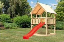 Das riesige Stelzenhaus Frieda von KARIBU in wahlweise terragrau oder naturbelassen, überzeugt mit extrem hoher Stabilität. Die Grundkonstruktion aus ca. 9 x 9 cm starken Massivholzpfosten ist für eine höhere Witterungresistenz kesseldruckimprägniert und bestehen aus Fichtenholz. Die ca. 19 mm dicken Wandbretter und das Dach sowie die Fußbodenbretter sind ebenfalls aus Holz hergestellt. Die Wandbretter werden im einfachen Steck/-Schraubsystem montiert, sodass schnell der neue Traum Ihrer Kinder im eigenen Garten steht. Das ist auf der Längsseite mit einem Brüstungselement, ebenfalls aus nordischer Fichte, versehen und bietet so ausreichenden Schutz. Die Podesthöhe von ca. 150 cm eignet sich ideal für Kinder jeder Altersklasse. Die Tür- und Fensteröffnungen sind aus Sicherheitsgründen nicht verschlossen. Auch das Haus Frieda hat ein Zertifikat vom TÜV-Nord für geprüfte Sicherheit (GS) nach DIN EN 71-1, DIN EN 71-3, DIN EN 71-8 und AfPS GS 2014. Auch können Sie die Farbe der Rutsche gemäß der Lieblingsfarbe Ihres Kindes eigens bestimmen. Weitere Varianten finden Sie in der Auswahl, sodass Sie auch dieses Haus nach Ihren Wünschen entsprechend gestalten können. Das riesige Zubehörsortiment sorgt dafür, dass Ihrer Phantasie keine Grenzen gesetzt sind. Als besonderes Highlight sind die außergewöhnlich schönen Farbsets zu nennen, die es Ihnen erlauben, das Stelzenhaus Frieda komplett einzigartig zu machen. Lassen Sie sich in der entsprechenden Zubehörrubrik inspirieren.