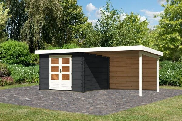 - Artikelbezeichnung: Gartenhaus „Bastrup 5“ SET AKTION anthrazit mit Anbaudach 3,0 m Breite, Anbaudach