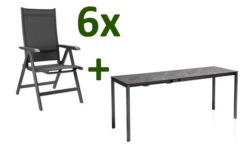 Bei dieser Esstischgruppe treffen hochwertige Materialien und Design auf modernste Weise aufeinander. Das Set besteht aus einem innovativen Ausziehtisch mit den Maßen von ca. 140/210×70 cm und 6 Multipositionssesseln der Marke Kettler aus der Serie „Basic Plus“.