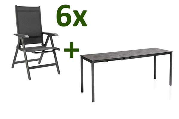 KETTLER Cubic/Basic Plus Esstischgarnitur, anthrazit, Alu/HPL/Textilene, ca. 140/210×70 cm, 6 Multipos