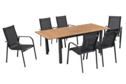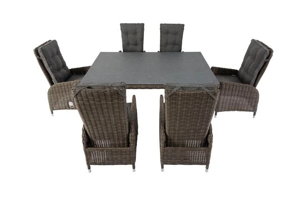 Dieses gemütliche Gartenmöbel Set bietet bequem bis zu sechs Personen Platz. Das Set besteht aus sechs Dining Sesseln und einem Dining Tisch. Hier können Sie bequem Ihr Mittag- oder Abendessen zu sich nehmen – und danach mit einem guten Buch in der Sonne liegen. Hierzu brauchen Sie einfach nur Platz zu nehmen und beim Sessel und den Sofas problemlos eine bequeme Liege- oder Sitzposition einstellen. Dies gelingt kinderleicht dank der integrierten Gasdruckfeder – die Rückenlehnen können mit einem kleinen Hebel an der Seite stufenlos verstellt werden. Der Sessel hat ein Gesamtmaß von ca. 65 x 55 x 112 cm. Die Sitzfläche ist ca. 50 cm tief, die Sitzhöhe mit Kissen liegt bei ca. 46 cm. Die Armlehnen mit einer Höhe von ca. 66 cm sorgen bei diesem Sessel für besonderen Komfort. Der praktische Diningtisch bietet dank seiner Maße von ca. 180 x 120 x 75 cm Platz für sechs bis acht Personen – so steht einem gemütlichen Mittagessen mit der Familie nichts im Wege. Er wird mit einer ca. 8 mm starken Spraystone Platte geliefert. Spraystone ist ein Kunststoff-Stein-Gemisch, das bei diesem Artikel auf Sicherheitsglas aufgesprüht und anschließend eingebrannt wird. Daraus ergibt sich eine wetter- und kratzfeste sowie pflegeleichte Oberfläche in einer eleganten Natursteinoptik, die sich mit einem milden Reiniger und einem Lappen kinderleicht pflegen lässt.