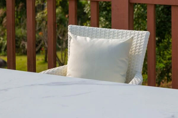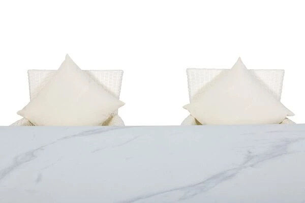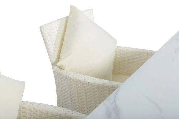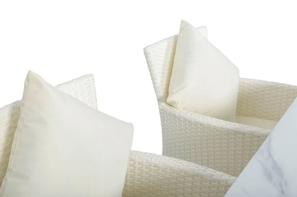 Das Untergestell der Möbel besteht aus Aluminium, dies macht sie nicht nur stabil, sondern sorgt auch dafür, dass sie sich aufgrund des relativ geringen Gewichts (je Sessel ca. 6,8 kg, Tisch ca. 42,8 kg) ganz leicht hin und her stellen lässt. Das Aluminiumgestell wird mit Polyrattangeflecht bespannt. Das flache Geflecht ist in der Farbe weiß (Faser w29) gehalten und passt so wunderbar zu allen möglichen Terrasseneinrichtungen. Gemütliche Sitz- und Rückenpolster (100 % Polyester) mit einer Stärke von ca. 5 cm sorgen für höchsten Sitzkomfort. Farblich sind die creme-weißen Polster perfekt auf das Geflecht abgestimmt. Die synthetische Faser Polyester wird für ihre Hitzebeständigkeit und optimalen Trage- und Pflegeeigenschaften geschätzt. Sollten Sie einmal Falten in Ihren Polstern haben, werden diese bei Wärme von alleine verschwinden, sodass die Bezüge komplett bügelfrei sind. Die Poster sind bequem, hautkühlend, waschbar und bügelfrei. Sie eignen sich perfekt für den Einsatz im Freien, was nicht zuletzt an ihrer wasserabweisenden und atmungsaktiven Materialzusammensetzung liegt.