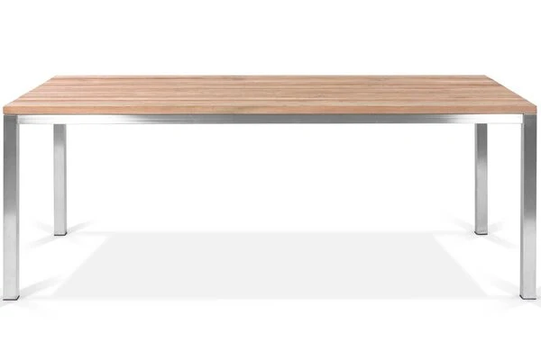 Das für die Tischplatte verwendete recycelte Teakholz verleiht dem Tisch einen ganz besonderen Charme. Die rustikal gebürstete Oberfläche sorgt dafür, dass die natürliche Struktur des Holzes erhalten bleibt und die Maserung besonders gut zum Vorschein kommt. Das Zusammenspiel aus dieser rustikalen Oberfläche und dem hochwertigen Edelstahlgestell, verleiht dem Tisch sein besonderes Aussehen und sorgt dafür, dass sie sich zu nahezu jeder Garteneinrichtung harmonisch kombinieren lässt. Die Stärke der Tischplatte von ca. 3 cm und die ca. 5 x 5 cm dicken Tischbeine unterstreichen das Zusammenspiel aus rustikalen und edlen Elementen zusätzlich.