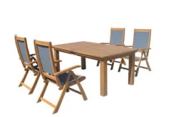 Die Esstischgarnitur besteht aus einem Esstisch mit den Maßen von ca. 180/220/260 x 100 x 76 cm sowie vier Klappstühlen. Der Akazienholztisch bietet mit seiner ca. 180 x 100 cm großen Tischplatte genügend Platz für vier Personen. Durch den Synchronauszug lässt sich der Tisch von ca. 180 cm auf ca. 220 cm oder auf ca. 260 cm ausziehen und bietet somit viel Platz für weitere Personen, wenn sich spontan Besuch ankündigt. Mit einer Breite von ca. 100 cm bietet Ihnen der Tisch genügend Platz, um ausreichend bestückt zu werden. Der Tisch besitzt mit seinen ca. 76 cm eine perfekte Höhe, um komfortabel sitzen zu können. Die Tischplatte hat eine Dicke von ca. 2,7 cm. Der Tisch hat ein Gewicht von ca. 47 kg, ist bis ca. 75 kg belastbar und weist dementsprechend eine hohe Stabilität auf.