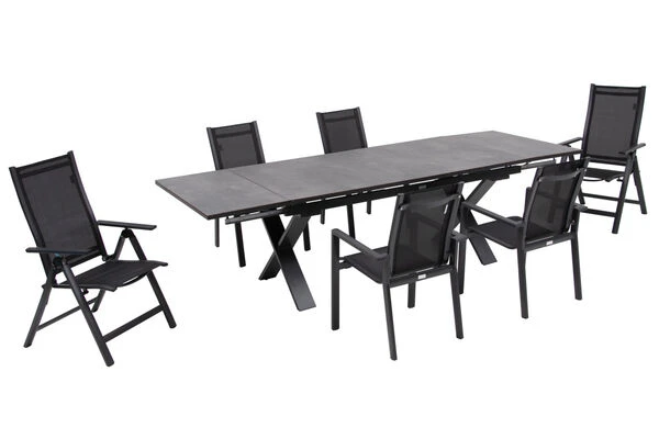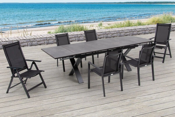 OUTFLEXX® Esstischgarnitur mit Ausziehtisch 180/280x100cm und 6 Stapel-/Multipositionssesseln aus Aluminium/HPL/Textilene in schwarz