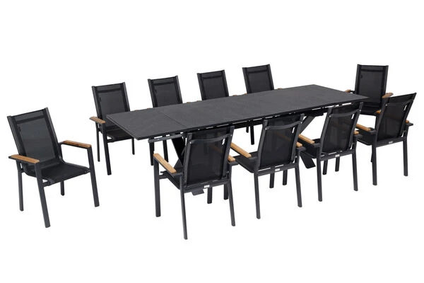11-teilige Esstischgarnitur von OUTFLEXX® aus Aluminium/Textilene, inkl. 10 Sessel mit Armlehnen aus recyceltem FSC®-Teakholz