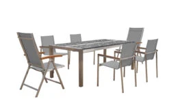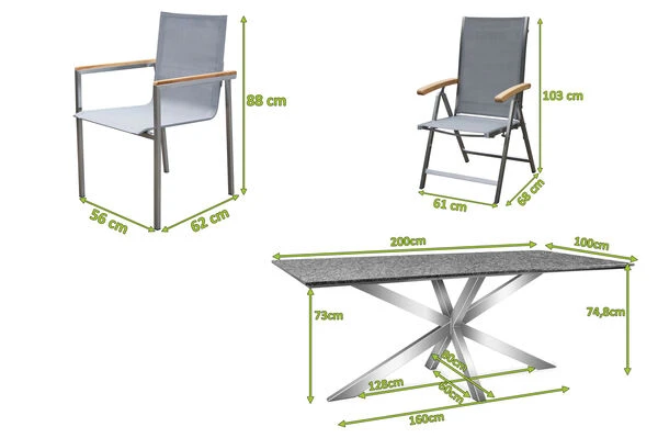 1x OUTFLEXX Esstischgarnitur, silber/anthrazit, Edelstahl/Granit/Textilene, 200×100 cm, 4 Gartensessel, 2 Multipos, Armlehnen aus FSC-Teak