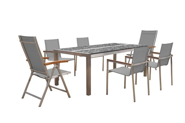 OUTFLEXX Esstischgarnitur, silber/anthrazit, Edelstahl/Granit/Textilene, 200×100 cm, 4 Gartensessel, 2 Multipos, Armlehnen aus FSC-Teak