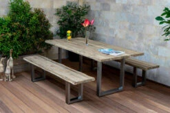 Die natürliche Struktur des Holzes bleibt durch die rustikal gebürstete Oberfläche erhalten und bringt somit die Maserung besonders gut zum Vorschein. Das verwendete Material sowie die hochwertige Verarbeitung sorgen dafür, dass die Esstischgruppe besonders robust und strapazierfähig ist. Mit einem Gewicht von ca. 47,5 kg (Tisch) bzw. 20,9 kg (Bänke) ist die Esstischgarnitur zusätzlich sehr stabil. Das recycelte Teakholz ist sehr witterungsbeständig sowohl gegen Hitze und Frost, als auch Feuchtigkeit und Regen. Teakholz hat einen hohen Anteil an holzeigenen Ölen und somit einen natürlichen Schutz gegen Pilze und andere Schädlinge und das Edelstahl ist rostfrei, dadurch beansprucht die Pflege dieser Esstischgarnitur nur einen minimalen Aufwand Ihrer Zeit. Des Weiteren macht die natürliche Baumkante den Esstisch zu was ganz Besonderem. Das verwendete Material lässt jede Esstischgruppe zu einem Unikat werden.