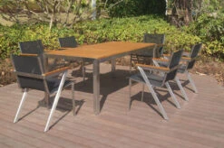 1x OUTFLEXX Esstischgarnitur, silber/natur, Edelstahl/Teak/Textil, 200×90 cm, 6 Stapelsessel, FSC-Teakholz