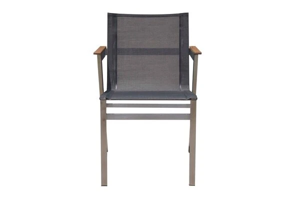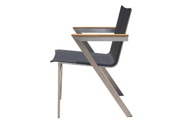 Setzen Sie einen Glanzpunkt auf Ihrer Terrasse: die designstarken Armlehnen sorgen nicht nur für Komfort, sondern sind wahre Hingucker. Der Sessel ist mit Maßen von ca. 60 x 56 x 85 cm mit bis zu ca. 150 kg belastbar und bietet Ihnen mit seiner Sitzbreite von ca. 47,5 cm und einer Sitztiefe von ca. 49 cm auch eine großzügige Sitzfläche, die jederzeit zum Verweilen einlädt. Das Gestell besteht aus gebürstetem Edelstahl der Güteklasse 304 im natürlichen Silberton, während die hautschmeichelnden Armlehnen – aus natürlichem Teakholz – dem Sessel sein außergewöhnliches Design verleihen. Im Zusammenspiel mit dem modern und puristisch gestalteten Gestell sorgt die Materialkombination für einen harmonischen Kontrast, der dem Stapelsessel Exklusivität und ein stilvolles Aussehen verleiht, das in jedem Gartendesign zum Highlight wird. Bespannt wird das solide Gestell mit Textilene (30% Polyester und 70% Vinyl) im passenden Schwarzton. Das Material ist unglaublich hautsympathisch und sorgt für ein herrlich luftiges Sitzgefühl, das Sie auch in der Sommerhitze nicht im Stich lässt. Dank des schlanken Designs und geringen Gewichtes von ca. 7,37 kg lässt sich der Sessel auch leicht transportieren, stapeln und platzsparend verstauen.