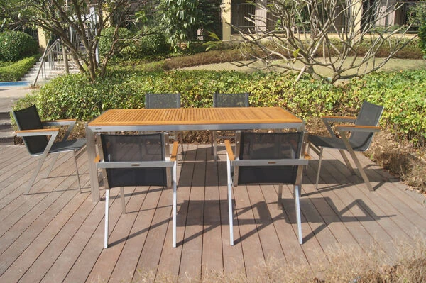 OUTFLEXX Esstischgarnitur, silber/natur, Edelstahl/Teak/Textil, 200×90 cm, 6 Stapelsessel, FSC-Teakholz
