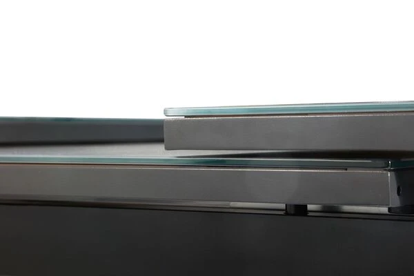 | Sicherheitsglas Das für die Tischplatte verwendete Sicherheitsglas verfügt über eine stark erhöhte Schlag- und Biegefestigkeit und eine hohe Temperaturwechselbeständigkeit, sodass warme Speisen auch direkt auf der Tischplatte abgstellt werden können. Sollte es einmal zu einem Bruch kommen, splittert das Glas nicht, sondern zerfällt in eine Vielzahl stumpfkantiger, kleiner Scherben mit wesentlich verminderter Verletzungsgefahr. |