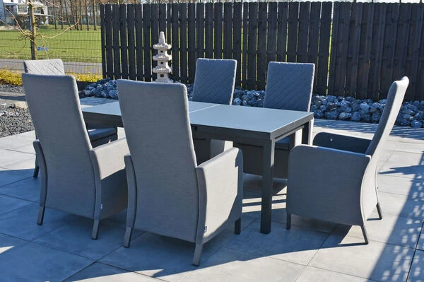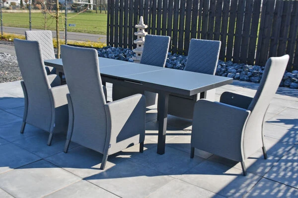 OUTFLEXX® Malaga Esstischgarnitur mit Premium Ausziehtisch aus Aluminium/Sicherheitsglas in OUTFLEXX® anthrazit matt/grau und 6 Malaga Sun Sessel aus Aluminium/Sunbrella in der Farbe Flanelle
