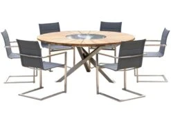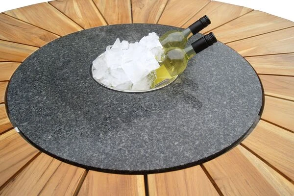 Die Besonderheit dieses Tisches liegt in der Funktionalität der Tischplatte, welche aus mehreren Komponenten besteht und für ein hohes Maß an Komfort sorgt. Die ca. Ø 170 cm große FSC®-zertifizierte Teakholztischplatte spendet genügend Platz für Teller, Gläser oder was sonst noch zu einem gemütlichen Grillabend mit der Familie gehört. Gewürze und Grillsoßen können auf dem ca. 46 cm breiten Granitring abgestellt werden. Dieser kann praktischerweise gedreht werden, sodass schwere Sachen nun nicht mehr quer über den Tisch gereicht werden müssen, sondern einfach und bequem zur anderen Seite des Tisches gedreht werden. Ein weiteres Highlight finden Sie in der Mitte der Tischplatte – eine eingefasste, herausnehmbare Edelstahlplatte kann bei Bedarf herausgenommen und durch den im Lieferumfang enthaltenen Eiskühler (ca. Ø 27 cm) ersetzt werden. So haben Sie ab sofort stets ein kühles Getränk zur Hand ohne dabei die gemütliche Runde verlassen zu müssen.