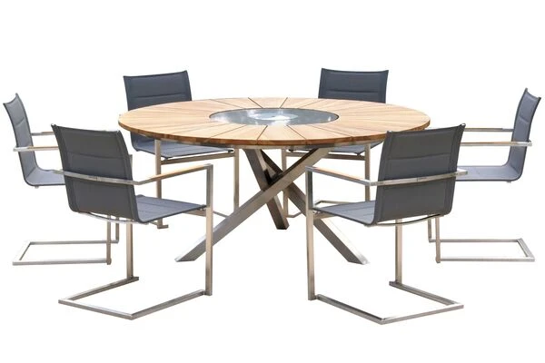 OUTFLEXX® Esstischgruppe für 6 Personen aus Edelstahl und FSC®-Teakholz