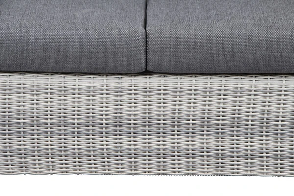 | Stabiles Polyrattan-Geflecht Das halbrunde Polyrattan-Geflecht GARDINO® in der Farbe ice grey zeichnet sich besonders durch seine Lichtechtheit und Stabilität aus. Es ist zudem besonders wasserabweisend und wetterfest. Das robuste Material schützt das Möbelstück somit bestens vor Witterungseinflüssen. |