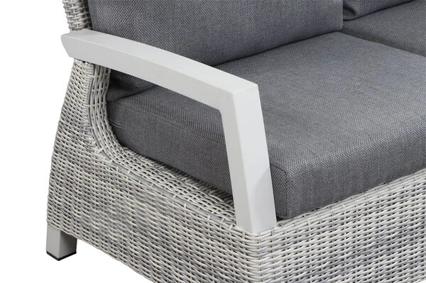 Einfach zurücklehnen und entspannen. Egal ob Sie die Beine hochlegen und ein gutes Buch in der Sonne lesen, gemütlich zusammen mit Freunden ein Kaffeekränzchen halten oder in gepflegter Atmosphäre den Alltag gemächlich an sich vorbeiziehen lassen möchten. Dieser bequeme 2-Sitzer mit einem Gesamtmaß von ca. 83 x 136 x 88 cm ist der ideale Begleiter und lädt Sie jederzeit zum Verweilen ein. Die ca. 128 cm breite Sitzfläche bietet genügend Platz für 2 Personen. Mit einer großzügigen Sitztiefe von ca. 63,5 cm und bei einer Sitzhöhe von ca. 36 cm ohne Kissen lässt es sich herrlich entspannen, allein oder zu zweit. Die praktische Armlehne auf der rechten Seite bietet zusätzlichen Komfort und ist zudem ein echter Hingucker. Passende, extra starke Kissen in der Trendfarbe „stone grey“ verleihen dem Sitzmöbel ein unvergleichliches Sitzerlebnis.