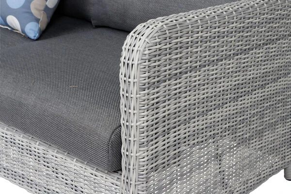| Stabiles Polyrattan-Geflecht Das halbrunde Polyrattan-Geflecht GARDINO® in der Farbe ice grey zeichnet sich besonders durch seine Lichtechtheit und Stabilität aus. Es ist zudem besonders wasserabweisend und wetterfest. Das robuste Material schützt das Möbelstück somit bestens vor Witterungseinflüssen. |