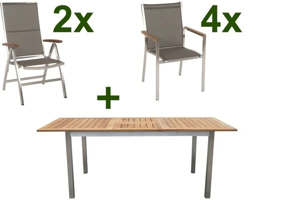 STERN Cardiff Esstischgruppe, silber/taupe, OUTFLEXX Ausziehtisch, FSC-Teak/Edelstahl, 4 Stapel-, 2 Multipositionssessel