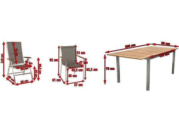 Bei dieser Esstischgruppe treffen besonders edle Materialien und zeitloses Design aufeinander. Das Set besteht aus einem Ausziehtisch der Marke OUTFLEXX mit den Maßen von ca. 150/200 x 90 x 75 cm, 4 Stapel- und 2 Multipositionssesseln der Marke Stern aus der Serie „Cardiff“. Die hellen Farben des Gestells sind in Verbindung mit der Farbe des Teakholzes ein echter Hingucker und sorgen für eine zeitlose Frische. Dadurch lässt sich die Esstischgruppe wunderbar mit anderen Farben kombinieren. So bleibt Ihnen viel Raum für kreative Gestaltungsmöglichkeiten. Die hochwertigen Materialien und die sorgfältige Verarbeitung sorgen nicht nur für die besondere Optik dieser Esstischgruppe, sondern machen sie auch sehr stabil.