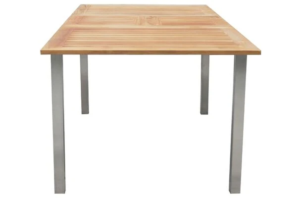 Die Tischplatte besteht aus ca. 2 cm starken Bohlen aus massivem, FSC-zertifiziertem Teakholz. Das Gestell aus hochwertigem 304er-Edelstahl gibt dem Tisch mit seinen ca. 5 x 5 cm starken Tischbeinen eine besonders hohe Stabilität. Die hochwertige Materialauswahl und die sorgfältige Verarbeitung sorgen nicht nur für die exklusive Optik dieses Ausziehtisches, sondern machen ihn mit einer Belastbarkeit von ca. 150 kg auch sehr stabil.