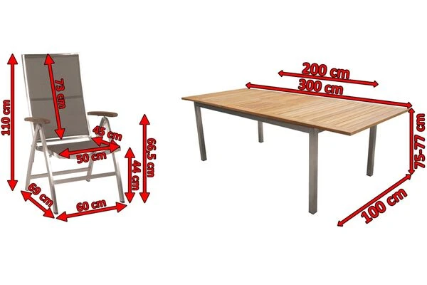 Bei dieser Esstischgruppe treffen besonders edle Materialien und zeitloses Design aufeinander. Das Set besteht aus einem Ausziehtisch der Marke OUTFLEXX mit den Maßen von ca. 200/300 x 100 x 75-77 cm und 6 Multipositionssesseln der Marke Stern aus der Serie „Cardiff“. Die hellen Farben des Gestells sind in Verbindung mit der Farbe des Teakholzes ein echter Hingucker und sorgen für eine zeitlose Frische. Dadurch lässt sich die Esstischgruppe wunderbar mit anderen Farben kombinieren. So bleibt Ihnen viel Raum für kreative Gestaltungsmöglichkeiten. Die hochwertigen Materialien und die sorgfältige Verarbeitung sorgen nicht nur für die besondere Optik dieser Esstischgruppe, sondern machen sie auch sehr stabil.