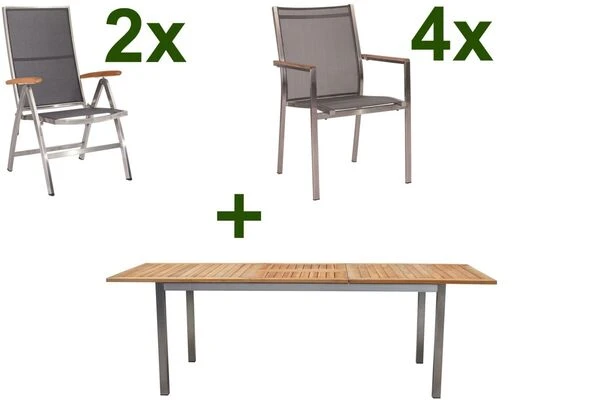 STERN Cardiff Set, silber/silbergrau, OUTFLEXX Esstisch, Edelstahl/FSC-Teakholz, 4 Stapel-, 2 Multipositionssessel