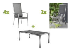 Diese erstklassige Tischgruppe mit Möbeln von STERN und OUTFLEXX® bietet nicht nur Platz für Gäste, sondern auch gehobenen Sitzkomfort. Lehnen Sie sich zurück und lassen Sie die Seele baumeln! Das Set bietet neben 2 Multipositionssesseln mit verstellbaren Rückenlehnen auch 4 bequeme Stapelsessel, die für das richtige Ambiente am hochwertigen Esstisch sorgen. So lässt man gerne den Alltag an sich vorbeiziehen.