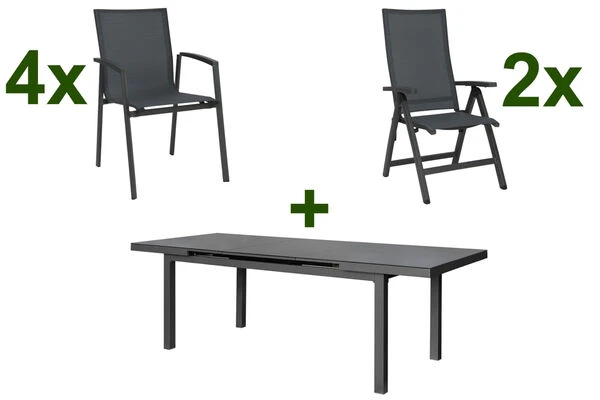 STERN New Top Esstischgarnitur aus Aluminium/Textilene, Anthrazit, Premium Ausziehtisch 180/240x100x77cm und 6 Stapel-/Klappsessel