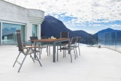 Diese Villana Esstischgruppe bietet genügend Platz für sechs Personen und besitzt auch in Sachen Komfort und Verarbeitung nur die beste Qualität. Die Farb- und Materialkombination aus Silber, Schwarz, Aluminium, Textilene und FSC-Akazienholz sorgt für eine rustikale Eleganz, welche die vielfältige Kombination mit anderen Möbelstücken oder Dekoration ermöglicht. Der Tisch kann bis auf eine Länge von ca. 200 cm ausgezogen werden – perfekt wenn sich noch spontaner Besuch ankündigt oder Sie einen schönen Grillabend mit Freunden und Nachbarn planen.